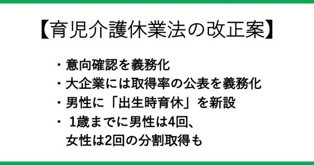 ② 大企業(従業員1000人以上)には、男性の育児休業取得率を毎年公表するよう義務づける。